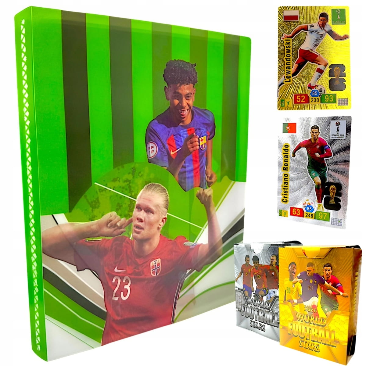 ✅ Postacie piłkarzy: karty przedstawiają legendy piłki nożnej oraz współczesne gwiazdy światowego futbolu.