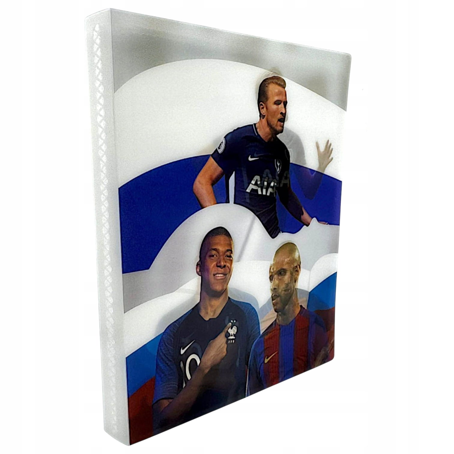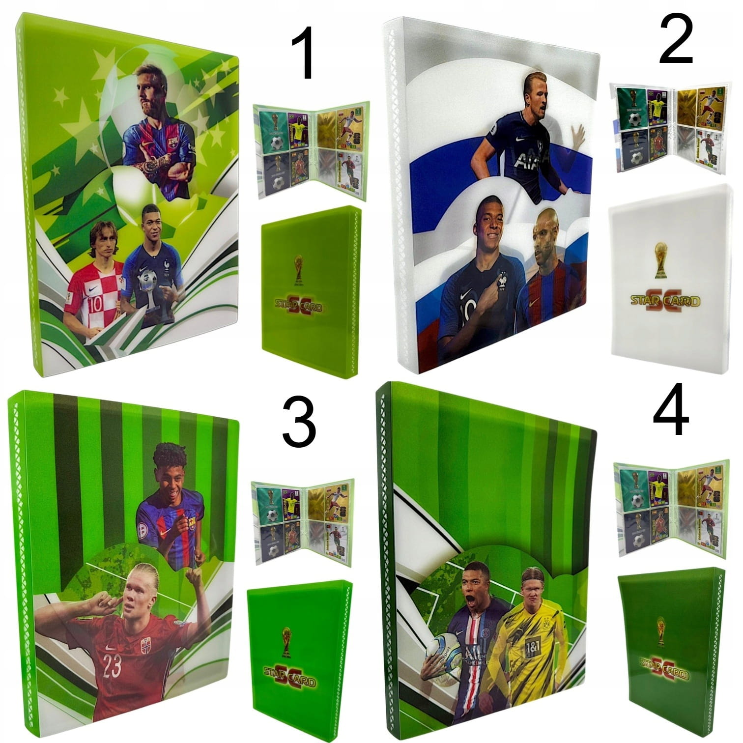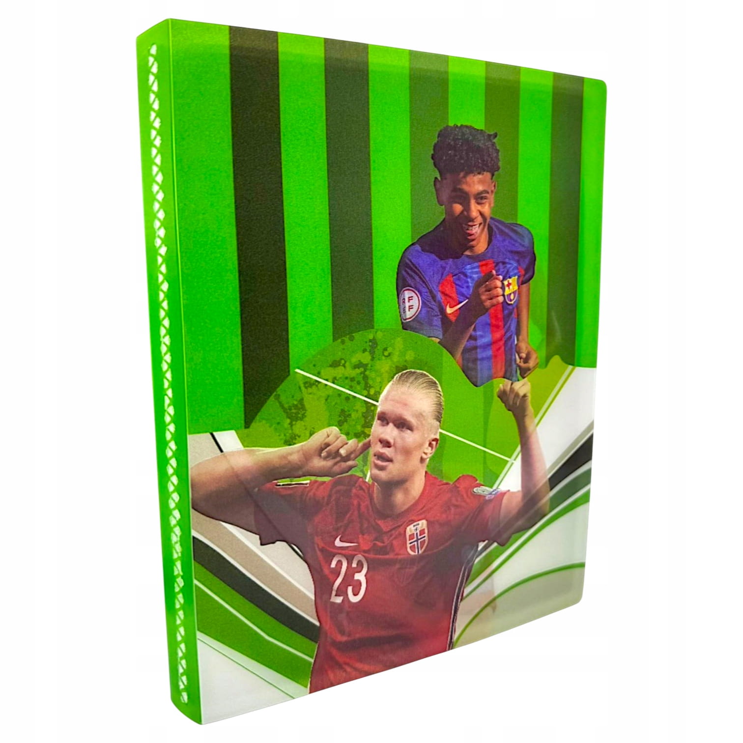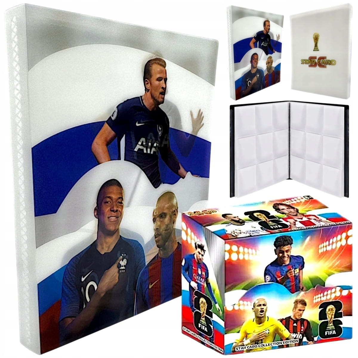 Zestaw dla kolekcjonera piłkarskich kart: solidny album/klaser + pojemny mega box. Album mieści 432 karty (układ 9 kieszeni × 24 strony, obustronnie). Foliowe, przezroczyste kieszonki chronią i eksponują karty, a okładka z ABS zapewnia trwałość. Dostępne 4 wzory okładek nawiązujące do gwiazd futbolu.