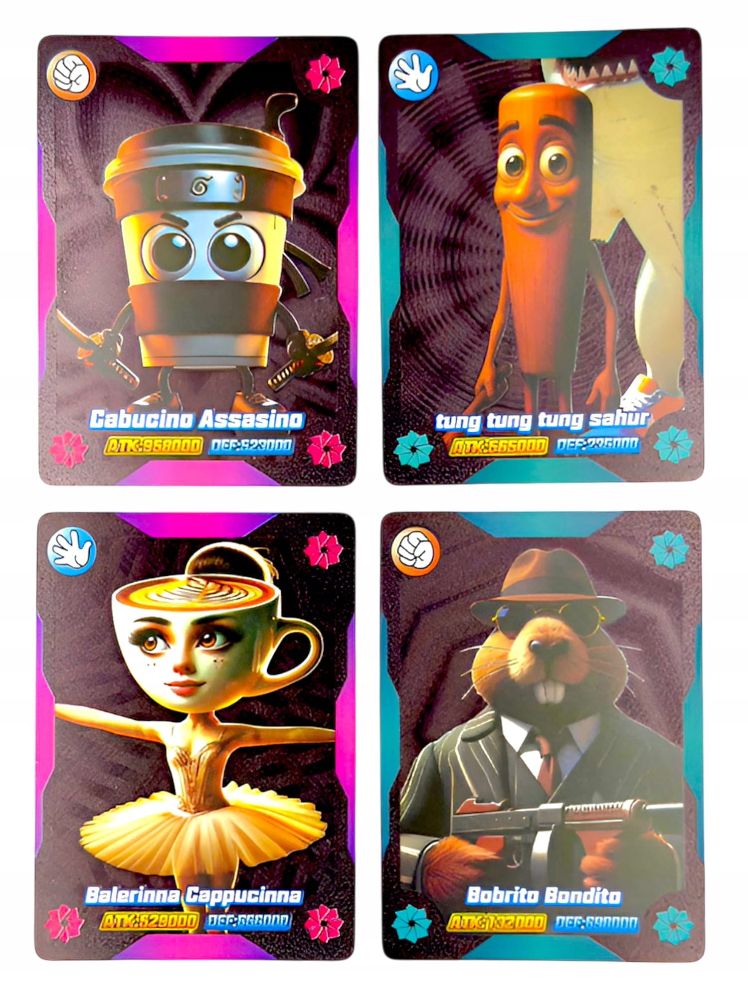 Karty przedstawiają kultowe postacie Brainrot, m.in. Tralalero Tralala, Bombardiro Crocodilo, Tung Tung Tung Sahur, Ballerina Cappuccina, Cappuccino Assassino, Bobrito Bandito i wiele innych.