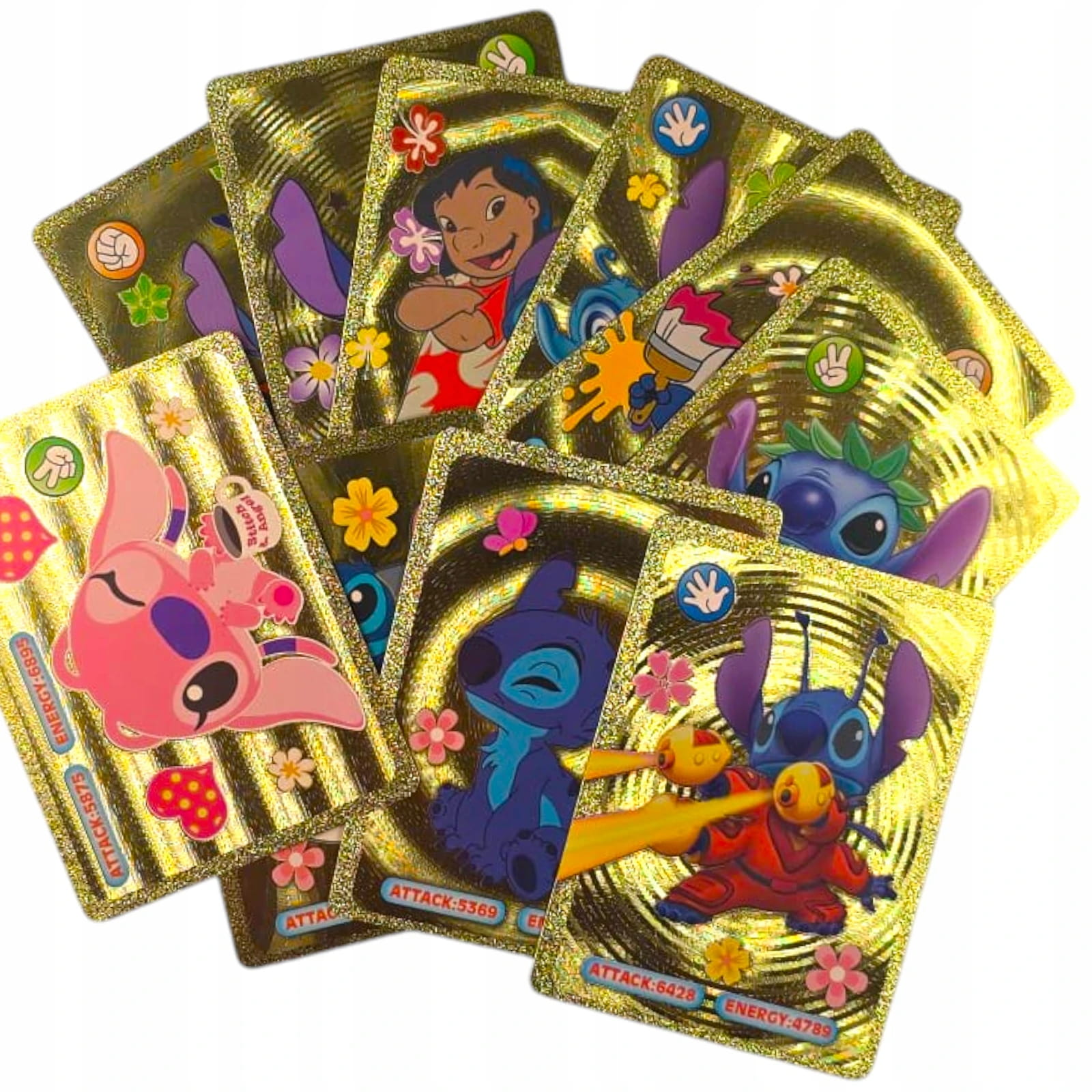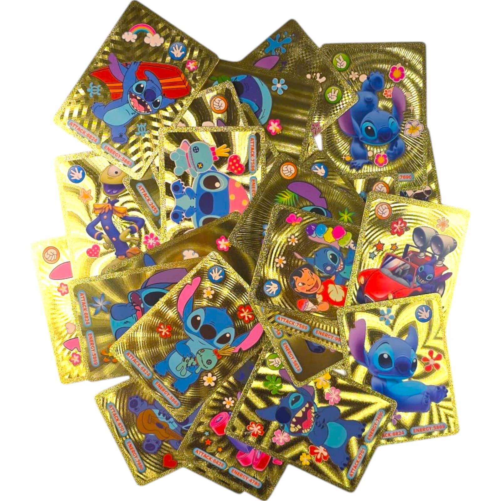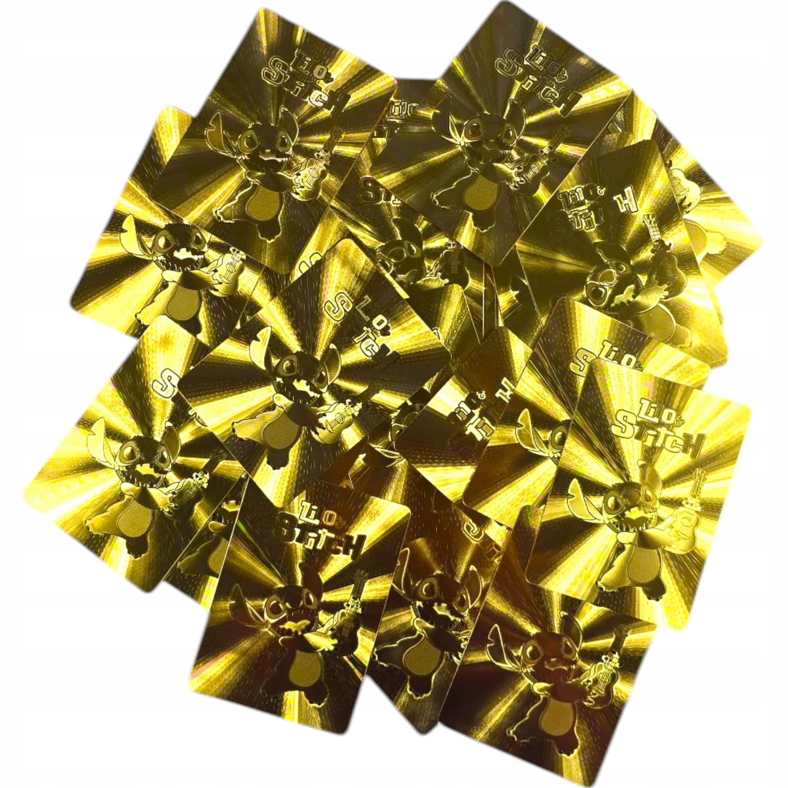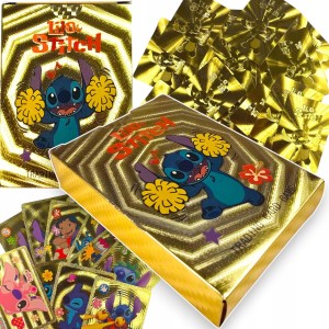 - 55 Złotych Kart: Nasz zestaw składa się z 55 kart o ekskluzywnym złotym wykończeniu, które przyciąga wzrok. Każda karta przedstawia ulubione postacie z serii Lilo i Stitch, dodając blasku i elegancji do Twojej kolekcji.