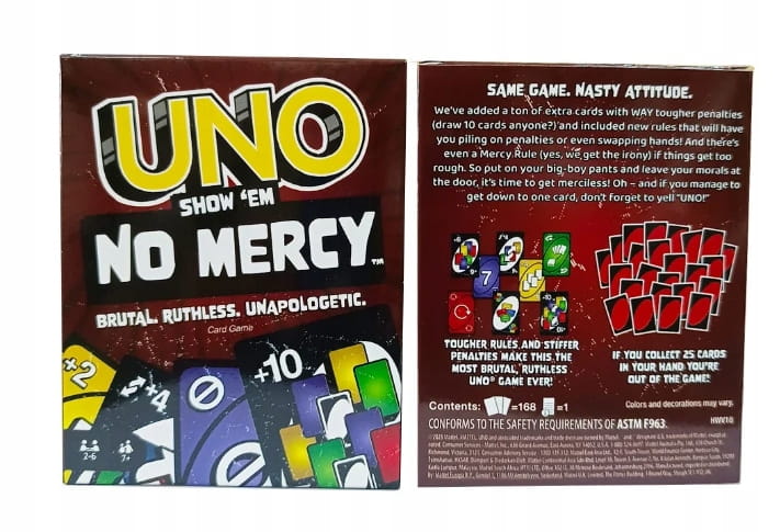 Przygotuj się na intensywną zabawę z grą karcianą Uno No Mercy! Ta emocjonująca wersja klasycznej gry UNO wprowadza nową dynamikę, w której nie ma miejsca na litość! To doskonała propozycja dla całej rodziny, która zapewni mnóstwo radości i rywalizacji.