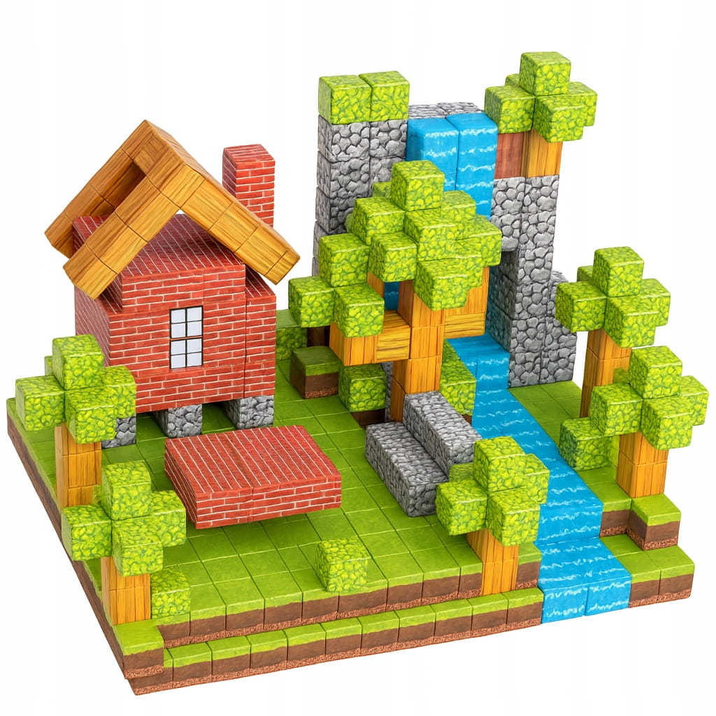 Wizualny styl gier: Design klocków (tzw. "pikselowe" tekstury) nawiązuje do najpopularniejszych gier survivalowych, co sprawia, że dzieci natychmiast rozpoznają ten styl i chętniej sięgają po zabawkę.