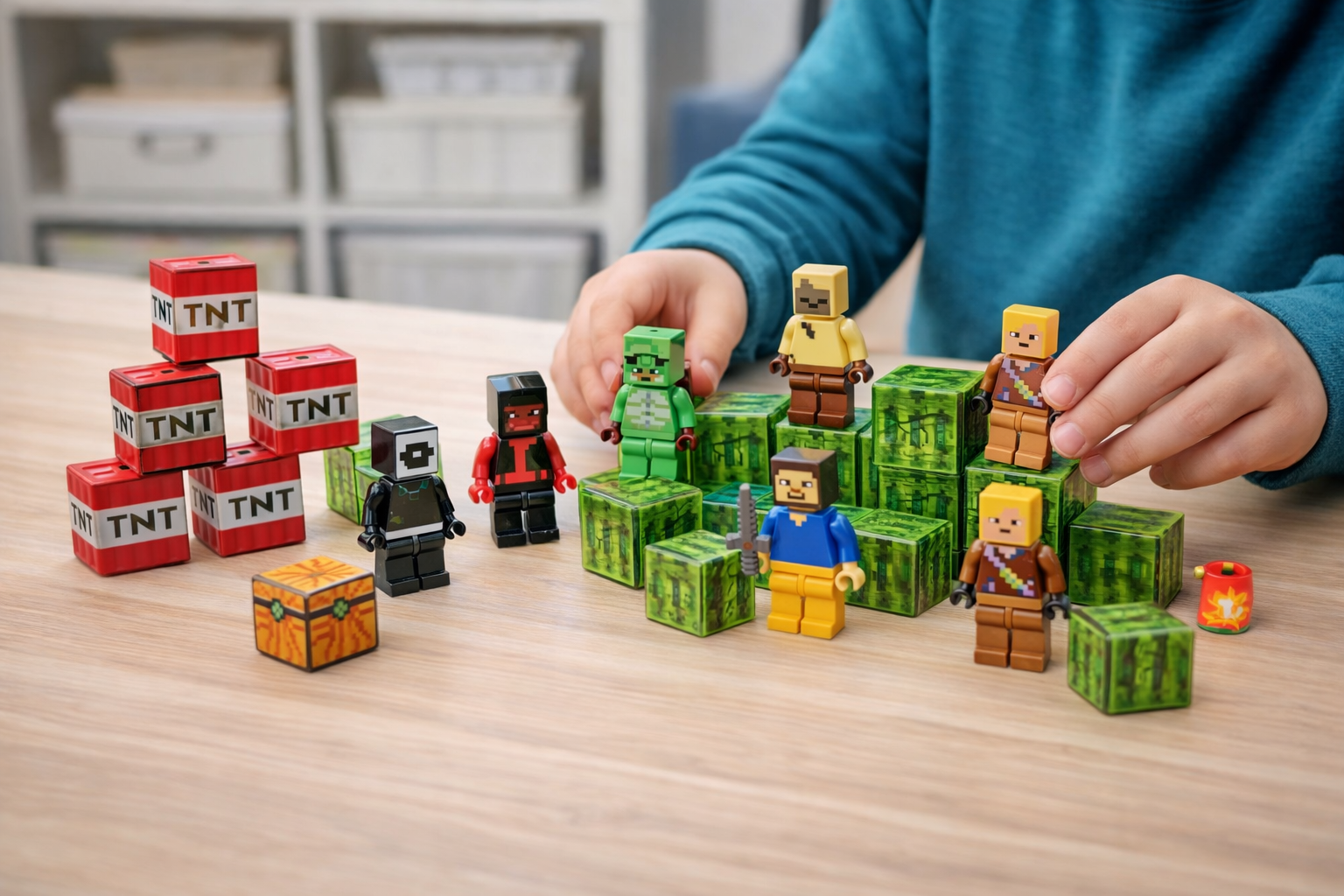 To nie tylko figurki – to interaktywna zabawa! W zestawie znajdziesz specjalne sześcienne bloki imitujące te z gry, które dzięki magnesom (lub specjalnym łączeniom) pozwalają na tworzenie stabilnych konstrukcji.